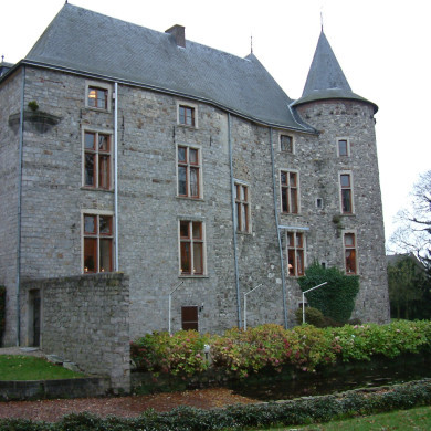 Kasteel; complex met een ronde hoektoren, van kiezelzandsteen, XV.