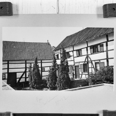 Haakvormig vakwerkcomplex, XVIII; huisingang met versierd bovenlicht; tweelichtvensters en dichtgemetselde tussendorpelvenster. Koperen pomp.