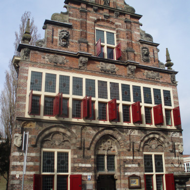 V.m. Stadhuis. Rechthoekig bakstenen bouwwerk, bestaande uit een laat-gotische benedenverdieping (1501) met in de door natuurstenen banden verlevendigde voorgevel geprofileerde en geblokte spitse ontlastingsbogen op consoles en een verdieping uit 1601, waarin in de voorgevel een breed venster, samengesteld uit zes gekoppelde houten kruiskozijnen. Tegen de rechter zijgevel een zeshoekige traptoren, waarvan het bovenste gedeelte in vereenvoudigde vorm is herbouwd bij de ingrijpende restauratie van 1889-1890 door de architect J. van Lokhorst. Rijke met natuurstenen sierdelen uitgevoerde trapgevel, gedateerd 1614, met obelisken, voluutstukken op de trappen, leeuwenmaskers, cartouches, gecanneleerde bakstenen pilasters en kraagstenen. Bovenstuk, waarin een nieuw Justitiabeeld, bij de restauratie weer aangebracht in vormen, die afwijken van de tekening door De Beijer uit 1749. Jaartalsteen: 1616, afkomstig van de gesloopte Rietvelderpoort. Op de rechter hoek een natuurstenen schandpaal. In het stadhuis op de verdieping een bij de restauratie uit oude onderdelen van diverse herkomst samengestelde schouw met gebeeldhouwde caryatiden (1630) en een gesneden kap. Voorts een gesneden tochtportaal met houten Justitiabeeld (1610). In het voorhuis een collectie fragmenten van laat-gotische sculptuur met resten van polychromie, opgegraven in 1930 bij de toren der Grote Kerk en afkomstig uit deze kerk; vier kraagstenen met schildhoudende engelen, drie koppen van heiligenbeelden waarvan een verenigd met de bijbehorende figuur, een romp van een Christusbeeld met kop afkomstig uit een Heilig Graf en een Ecco Homo waarvan de kop beschadigd is, met doornenkroon. Voorts enige fragmenten van apostelbeelden.