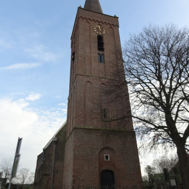 Toren der Hervormde Kerk. De forse toren bestaat uit drie weinig versneden geledingen; ingang gevat in een spitsbogige omlijsting en door een natuurstenen korfboog gedekt; de tweede en derde geleding versierd door telkens drie spitsbogige spaarvelden aan iedere zijde; de gemetselde balustrade is tegelijk met de spits in machinale steen vernieuwd. Steen 1612. Klokkenstoel met klok van Pieter Vermaten, 1695, diam. 117,5 cm.