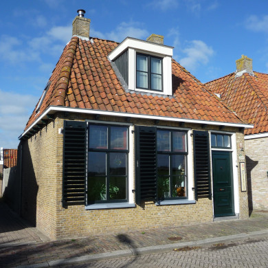 Een eenvoudige 19e eeuwse woning onder schilddak met een hoekschoorsteen.
