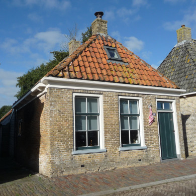 Een eenvoudige 19e eeuwse woning onder schilddak met een hoekschoorsteen.