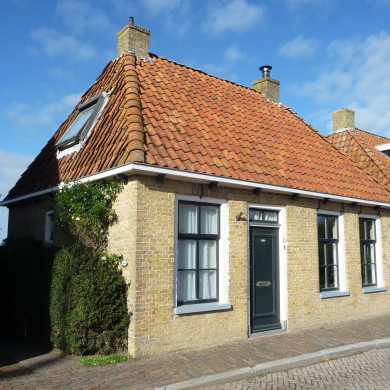 Een eenvoudig 19e eeuwse woning onder schilddak met twee hoekschoorstenen.