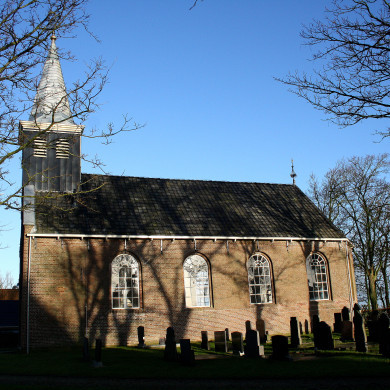 Ned.Herv.Kerk. Eenvoudige laatgotisch bakstenen kerkje met houten dakruiter boven westgevel.