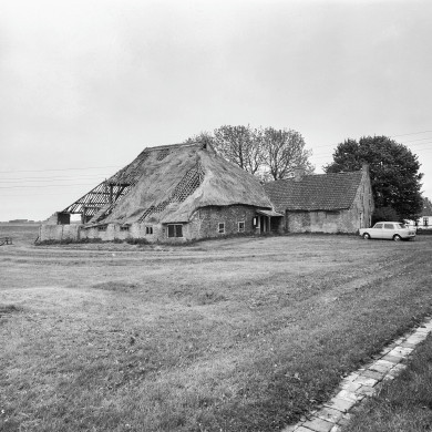 Grote boerderij, kopromptype met twee schoorstenen, 9-ruitsvensters. Zeer brede schuur.