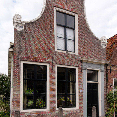 Woonhuis onder zadeldak tegen klokgevel met geornamenteerde daklijst, Anno 1762.