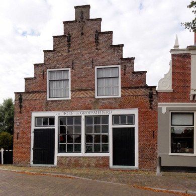 Pand onder zadeldak tegen bakstenen trapgevel met fries van baksteenvlechtwerk.