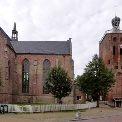 Grote of Gertrudiskerk, kerkhof (Zuider- Ooster- en Groot Noorderkerkhof rondom de kerk en het Klein Zuiderkerkhof ten zuiden van de toren), kerkhofpoort bij het Kleine Zuiderkerkhof, houten hekwerk rondom en op de keermuur, groenaanleg bestaande uit gedeeltelijke lindenbeplanting.