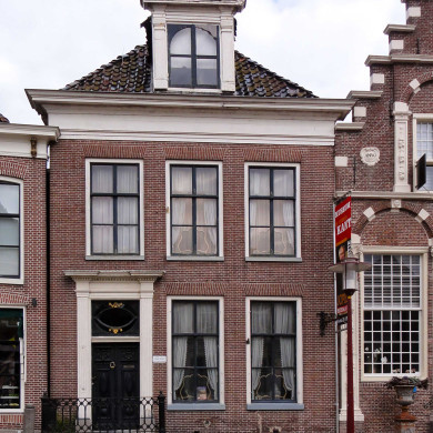 Pand met verdieping en vliering onder zadeldak tegen rijk en ondogmatisch versierde trapgevel, Anno 1663.