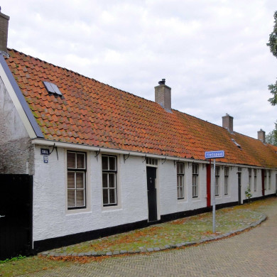 Vier diaconiewoningen aan het kerkplein onder doorgaand zadeldak.