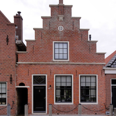 Woonhuis onder voor afgeschuind zadeldak; omlijste ingang, vier grote gebeeldhouwde consoles op de gootlijst, grote dakkapel en vier versierde stoeppalen.