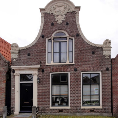 Pand onder zadeldak tegen klokgevel met aanzetkrullen waaronder jaartalstenen anno 1765 en gebeeldhouwde bekroning.