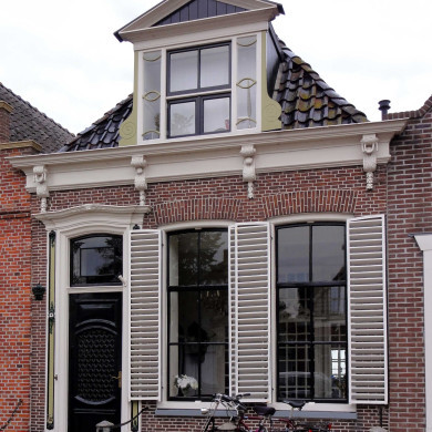 Woonhuis onder voor afgeschuind zadeldak; omlijste ingang, vier grote gebeeldhouwde consoles op de gootlijst, grote dakkapel en vier versierde stoeppalen.