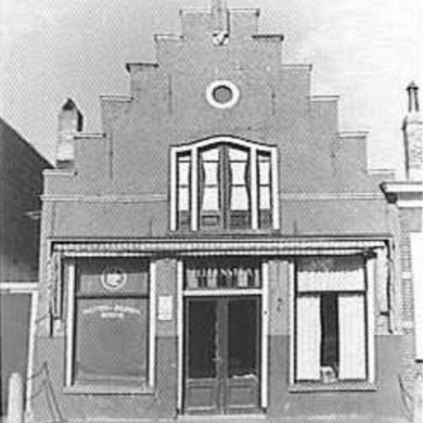 Eind 19e eeuw van groter venster in top voorzien, omlijste ingang.