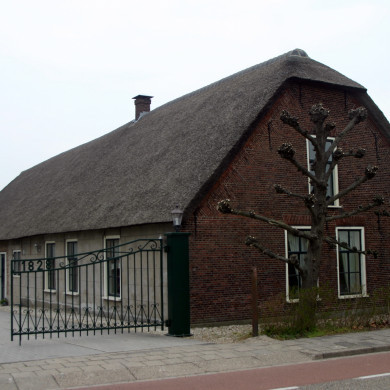 Boerderij, eerste helft 19e eeuw, onder rieten wolfdak. Het woongedeelte heeft een puntgevel met vlechtingen en vensters met zesruitsschuiframen. Rechts onderkelderd. Houten karnhuis met rieten tentdak.