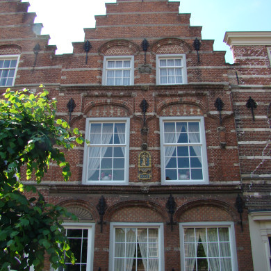 Huis "In den salamander", onder zadeldak en met trapgevel van het "Dordtse" type, met natuurstenen baden, waterlijsten en blokken, geprofileerde korfboogvormige ontlastingsbogen met metselmozaïek in de boogvelden boven de vensters, waartussen -in de verdieping- gekartelde zuiltjes op kraagstenen
