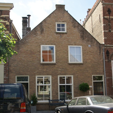 Huis "In den salamander", onder zadeldak en met trapgevel van het "Dordtse" type, met natuurstenen baden, waterlijsten en blokken, geprofileerde korfboogvormige ontlastingsbogen met metselmozaïek in de boogvelden boven de vensters, waartussen -in de verdieping- gekartelde zuiltjes op kraagstenen
