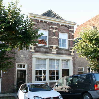 Huis onder schilddak en met tot een lijstgevel afgeknotte gevel van het "Dordtse" type uit omstreeks 1600, met banden van natuursteen, korfbogen boven de vensters, metselmozaieken en gebeeldhouwde kraagstenen in het fries boven de onderpui.