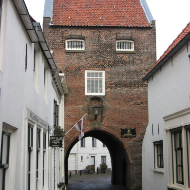 Water- of Gevangenpoort. Rechthoekig bakstenen bouwwerk, dat blijkens de inwendige kap- en balkenconstructie na 1573 (verwoesting van de stad) opgetrokken is. Op de noordoosthoek een op boogfriezen rustende, veelhoekig uitgekraagde arkeltoren (een gelijke op de noordwesthoek verdwenen). Spitsboogvormige doorgangen met boognissen daarboven. Inwendig een stenen steektrap met troggewelf.
