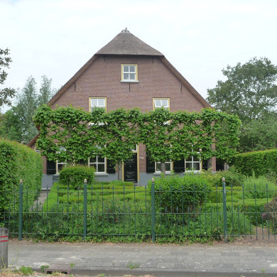 Boerderij van het dwarsdeeltype, Overmase vorm; bakstenen gebouw onder afgewolfd rieten zadeldak. Symmetrische voorgevel met zesruits vensters en paneeldeur. Belangrijk v.w. ligging. XIX.