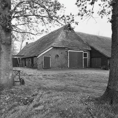 BOERDERIJ gelegen aan de grens van het Reestdal. Houten schuur onder rieten schilddak.