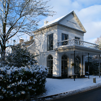 HUIS DE WILTKAMP. Witgepleisterd omstreeks 1800 gebouwde HOFSTEDE in empire-stijl, bestaande uit een aan de oostzijde gelegen voorhuis en een naar het westen gericht achterhuis. Het voorhuis kwam wellicht eerder tot stand dan het achterhuis; beide staan geregistreerd op het Kadastraal Minuutplan uit 1827. Het voorhuis is in twee bouwlagen opgetrokken en wordt door een met grijze pannen gedekt zadeldak bekroond. Aan de voorzijde wordt de gevel boven de kroonlijst door een fronton afgesloten met in het veld van het tympaan de naam van de hofstede. Indeling voorgevel voorhuis: in twee traveeën gelede gevel met twee terrasdeuren met empire 6-ruitsindeling en met halfrond bovenlicht met drie door twee gebogen roeden gescheiden vensters. In de zijgevels van het voorhuis een enkele hieraan identieke terrasdeur. Op de verdieping twee op de traveeen gelegen balkondeuren met empire 6-ruitsindeling. In de zijgevels op de verdieping een enkel empire 6-ruitsvenster. Aan de voorzijde van het voorhuis is een veranda met ruim overstek geplaatst, die door drie slanke gietijzeren staanders wordt gestut. De veranda is voorzien van een smeedijzeren empire balustrade, samengesteld uit een zich herhalend motief van ineengevlochten puntovalen en ruiten met boogvormig ingezwenkte vlakken. Het achterhuis is ter hoogte van het voorhuis aan het zicht onttrokken door twee vleugelmuren aan weerszijden van de achterzijden van het voorhuis. De vleugelmuren zwenken aan de bovenzijde voluutvormig naar buiten in. Op het eindpunt van deze inzwenking is een stenen siervaas opgesteld. Halverwege de vleugelmuren bevindt zich een licht vooruitspringend veld met centraal gelegen nis, waarin een marmeren beeld op sokkel is geplaatst. Beide beelden, die bij elkaar horen en wellicht deel uitmaakten van een grotere set, dateren uit de 18e eeuw. Er is wel gesuggereerd, dat het linker beeld flora en het rechter beeld fauna voorstelt. De beelden staan op een driehoekige sokkel met boogvormig ingezwenkte vlakken, die zich naar boven verjongen. Centraal op het naar voren gerichte vlak een medaillon met keizerbuste in reliëf. Uit het Kadastraal Minuutplan uit 1827 blijkt, dat ter hoogte van het huis De Wiltkamp een stukje van de aardwerken van Wijk bij Duurstede waren afgegraven en dat hier aan de rand van de wallen een vijverpartij was aangelegd. Op deze wijze was er vanaf huis De Wiltkamp reeds voor 1827 een gezicht geschapen op de wallen met de ruine van het voormalige kasteel van Wijk bij Duurstede in het verschiet. Na de heraanleg van de aardwerken tot het huidige park in landschapsstijl door de tuinarchitect Jan David Zocher jr. (1791-1870) vanaf 1852 heeft het huis een betekenis als een belangrijke vedute van deze aanleg gekregen. Met name ter hoogte van de brug ten westen van de ruine heeft huis De Wiltkamp, waarvan vanuit het park het voorhuis associaties met een klassieke tempel kan oproepen, een grote ornamentele waarde als "point de vue".