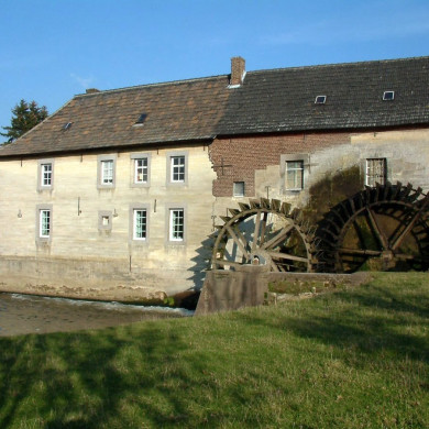 WATERMOLEN; uit mergel en baksteen opgetrokken pand met verdieping onder met muldenpannen gedekt wolfdak; in de witgeverfde voorgevel met geteerde plint, zes vensters met hardstenen omlijsting voorzien van luiken en een gedeeld bovenlicht op de begane grond en 6-ruits ramen op de verdieping, deur met 3-ruits bovenlicht en daarboven een hijsluik met gedeeld bovenlicht, beide met hardsteen omlijsting, en jaartalankers 1776; in de linker zijgevel 4, grotendeels gedichte, vensters met hardstenen omlijsting; in de achtergevel 3 vensters met 6-ruits ramen en hardstenen omlijsting; aan de achterzijde de uit baksteen en natuursteen vervaardigde molengang en twee onderslagraderen. Aan de watermolen vastgebouwd een woonhuis met schuur op L-vormige plattegrond, beide met verdieping en onder met muldenpannen (woongedeelte) en Hollandse pannen (schuur) gedekte zadeldaken. De in baksteen opgetrokken voorzijde van het woonhuis heeft op de b.g. rechtgesloten T-vensters en een met hardsteen omlijste deur met bovenlicht en op de verdieping getoogde 6-ruits vensters; (bij de restauratie van de achtergevel in 1962 werd deze geheel opgetrokken in blokken mergel en voorzien van 6- en 8-ruits vensters met hardstenen omlijsting). De schuur heeft twee met hardsteen omlijste deuren met een smaller bovenlicht en 2 vensters op de verdieping.