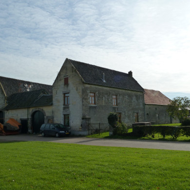 Hoeve met binnenplaats, XVIII-XIX; mergel met onderbroken topgevelomlijsting; vakwerkschuur.