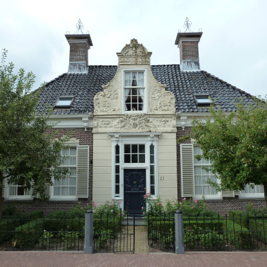 Het in 1737 gebouwde WOONHUIS is gesitueerd tegenover een dwarsstraat, waar zich voorheen een overtuin met theehuis bevond. Het voorname huis met barokke (Lodewijk XIV) ingangspartij is gebouwd in opdracht van de hooischipper Bauke Aukes en diens echtgenote Janke Ennes. In de cartouches in de geveltop staat het jaartal 1737 vermeld. Het huis kwam in 1790 in het bezit van Wigle Annes Visser, "koopman in vis en aal", lid van de vermaarde Heger koopmansfamilie Visser. Het huis werd in 1904 verkocht en fungeerde daarna als onderwijzerswoning van het hoofd der gereformeerde school. De school verrees in de achtertuin. In de jaren zeventig is op een der deuren van de woonkamer een 18de-eeuwse schildering aangetroffen, voorstellende de Liefde. Twee uit dezelfde kamer verdwenen deuren droegen waarschijnlijk symbolische voorstellingen van de Hoop en het Geloof. Het huis heeft een ondiepe voortuin met een erfscheiding in de vorm van een 19de-eeuws hekwerk van gietijzer, bevestigd aan zes hardstenen palen.