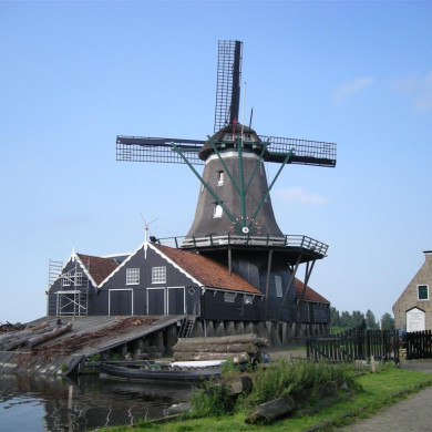 De Rat. Bovenkruier met stelling afkomstig uit de Zaanstreek, 18e eeuwse houtzaagmolen met zaagloodsen en sleephelling.