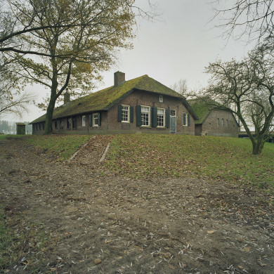 Veluwse boerderij onder rieten schilddak met in het woongedeelte vensters met 20-ruitsschuiframen en luiken, 18e eeuw.