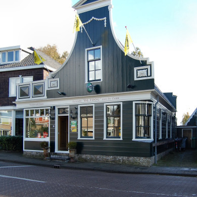 Houten huis, aan de voorzijde voorzien van ingezwenkte voorschot met rijke bekroning in Lodewijk XVI-STIJL, guirlande en zijmeanders. Pui met gebogen overhoekse vensters. Rechts naast de gevel de voordeur met kussenpanelen en diamantkopversiering. Daarboven een gesloten balustrade. XIXa.