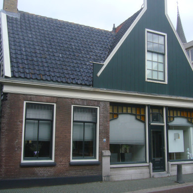 Houten herenhuis met verdieping en schilddak, XIXa. Geprofileerde vensteromlijstingen met sluitstukjes. In het midden dubbele deuren en snijraam in een pilasteromlijsting met gesneden fries. Dakkapel met ingezwenkte zijkanten, een fronton, een rond venster.