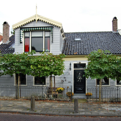 Houten huis onder zadeldak, eerste helft 19e eeuw. Grote dakkapel met gesneden lijst.