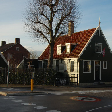 Zaans huis (houten) in oorsprong 17e eeuws, met stenen voorgevel, bekroond door houten voorschot. Interieurdetails 18e eeuw.
