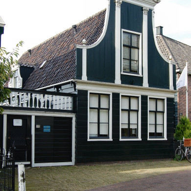 Houten huis, afkomstig van Oostzijde 8; haaks hier tegenaan een houten huisje met overhoekse vensters en een ingezwenkt voorschot topguirlande en zijmeanders(afk. van Bloemgracht 21).
