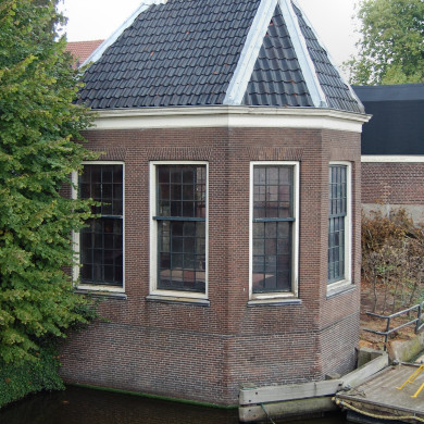Twee van de voormalige Duikersluis afkomstige natuurstenen bekroningen in Lodewijk XVI-stijl, met wapens het Hoogheemraadschap der Uitwaterende Sluizen in Kennemerland en West-friesland, van de dijkgraaf en hoogheemraden alsmede Neptunus, gezeten op een dolfijn en een bazuinblazend knaapje met ee
