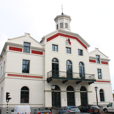 Raadhuis, neoclassicistisch gebouw met koepeltorentje, ranken en meanderfriezen en een gevelsteen met het wapen van Zaandam. 1846-'47 naar ontwerp van W.A.Scholten.