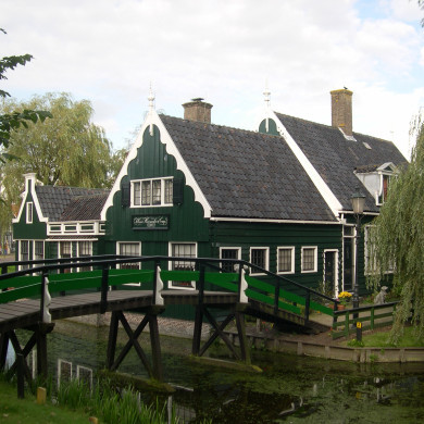 Houten huis, afkomstig van Oostzijde 8; haaks hier tegenaan een houten huisje met overhoekse vensters en een ingezwenkt voorschot topguirlande en zijmeanders(afk. van Bloemgracht 21).
