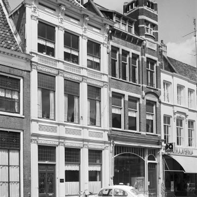 PAND met gepleisterde lijstgevel uit het derde kwart der 19e eeuw. De verdiepingen, gescheiden door brede hoofdgestellen, worden onderverdeeld door pilasters met composiet kapitelen. Boven de vensters van parterre en verdieping friezen van lofwerk. De kroonlijst is boven de vier neo-Lodewijk XIV-consoles omgekornist.