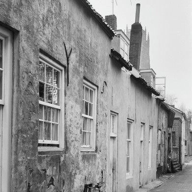 Gepleisterd huisje achter Vismarkt 2/Korte Strikstraat 1. 17e of 18e eeuw. Vensters met 19e eeuwse schuiframen.