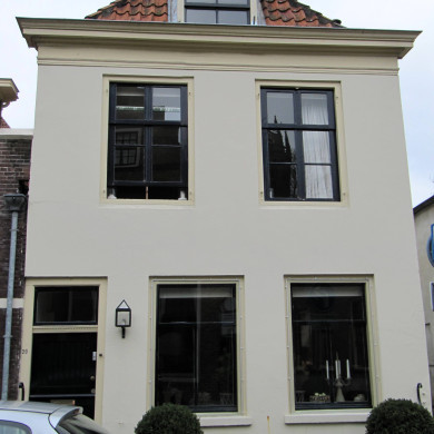 Pand met verdieping en gewijzigd schilddak. De zes assen brede bakstenen gevel dateert uit het derde kwart van de 19e eeuw, heeft twee gebosseerde pilasters, vensters met hardstenen dorpels en zesruitsschuiframen en een houten kroonlijst. Hardstenen stoeppalen op de hoeken.