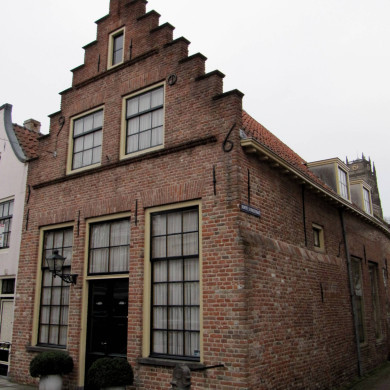 HOEKPAND met zadeldak en gepleisterde trapgevel, waarin jaartalankers: 1690. Toppilaster met bekronende leeuw met wapenschild. Gebeeldhouwde schamppaal, eerste kwart 17e eeuw.