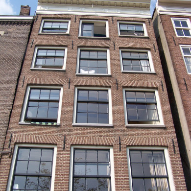 Pand met gevel (XVIIc/d) onder rechte lijst en stenen topje (XIXc) ; gedenksteen voor de natuurkundige Jan Swammerdam (1880).