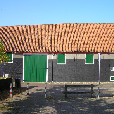 Houten zwartgeteerde schuur met pannen gedekt, naast de Wolwelle.