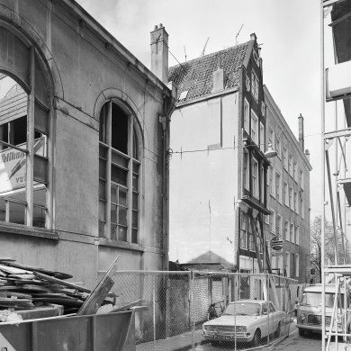 Hoekpand (tweede kwart zeventiende eeuw) omvattende twee woningen onder een dak, met gepleisterde ingezwenkte halsgevel boven originele zandstenen kelderpui (tweede kwart zeventiende eeuw). Gesneden houten pui met deurkalven en snijramen (eerste kwart negentiende eeuw).