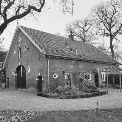 19E-EEUWSE WONING in rode baksteen opgetrokken onder met grijze pannen gedekt zadeldak aan het begin van de oprijlaan (op het kadastrale perceel Laren nr. A1432).