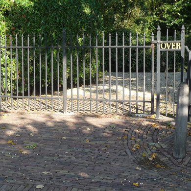 ZUIDELIJK TOEGANGSHEK. Rechthoekig smeedijzeren 19e-eeuws dubble hek van regels en stijlen met pijlpuntvormige bekroning, met twee smalle vleugelstukken met identieke stijlen en regels aan de openbare weg, aan de zuidelijke oprit. Boven aan het linker vleugelstuk in vergulde smeedijzeren letters OUD en boven aan het rechter vleugelstuk in vergulde letters OVER. Ter weerszijden van de vleugelstukken zich naar de zijkanten boogsgewijs verjongende zijstukken met identieke stijlen en regels.