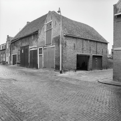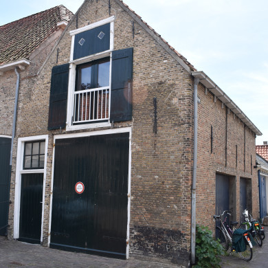 Schuur-pakhuis, langsgevel aan Karsteil. Zijtopgevel met vlechtingen. XVIII-XIX.