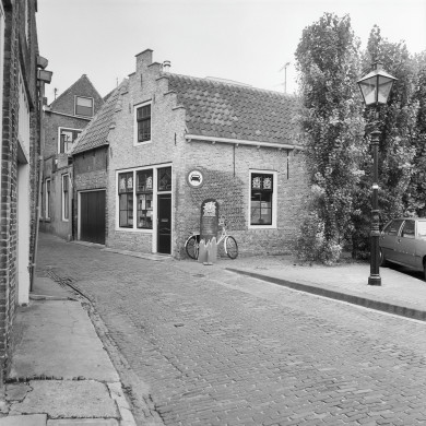 Middeleeuws pand achter 19e-eeuwse gevel. De eerste vier balkvakken met een sleutelstuk boven de begane grond, een korbeelstel op de verdieping en de bijbehorende spantjukken dateren uit de late 14e of uit het begin van de 15e eeuw. De laat-gotische sleutelstukken met peerkralen boven de b.g.